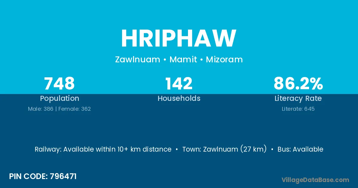 Zawlnuam (27 km) is the nearest town to Hriphaw village for major economic activities and is located approximately 27 km away.