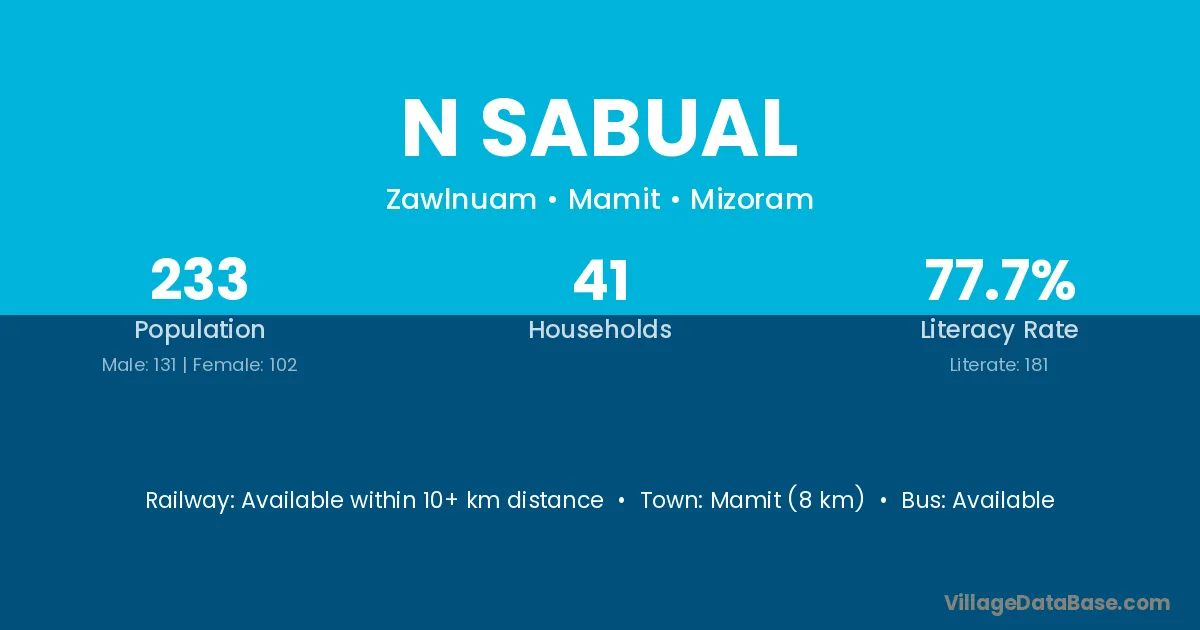Mamit (8 km) is the nearest town to N Sabual village for major economic activities and is located approximately 8 km away.