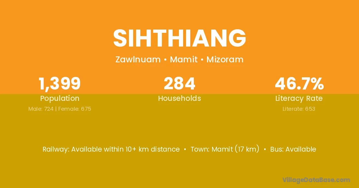 Mamit (17 km) is the nearest town to Sihthiang village for major economic activities and is located approximately 17 km away.
