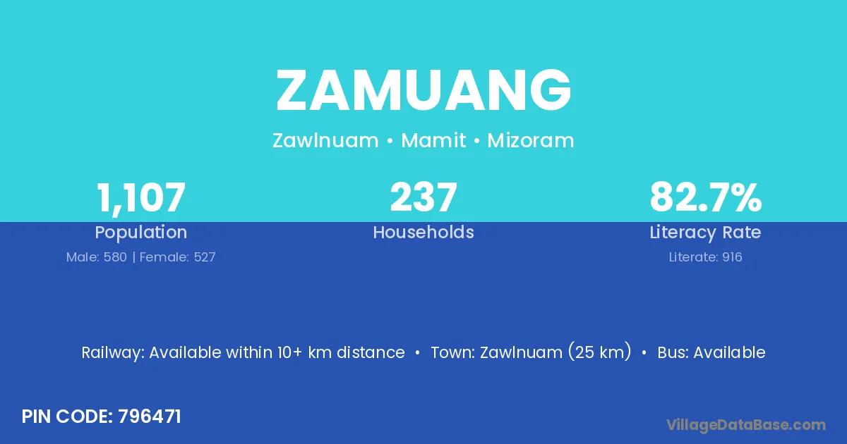 Zawlnuam (25 km) is the nearest town to Zamuang village for major economic activities and is located approximately 25 km away.