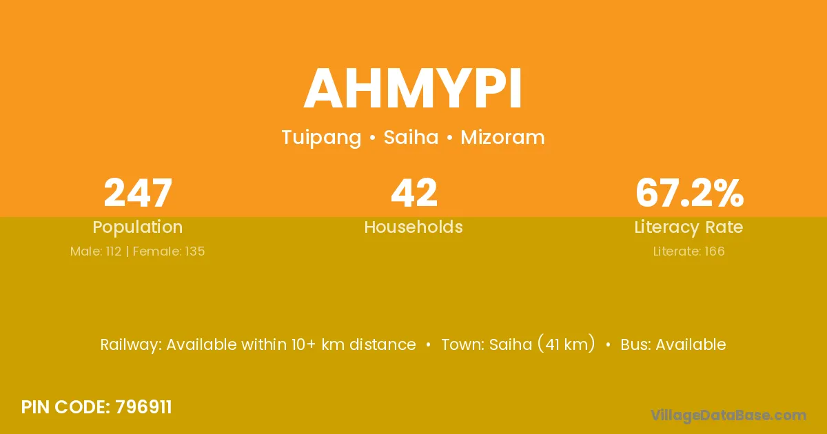Saiha (41 km) is the nearest town to Ahmypi village for major economic activities and is located approximately 41 km away.