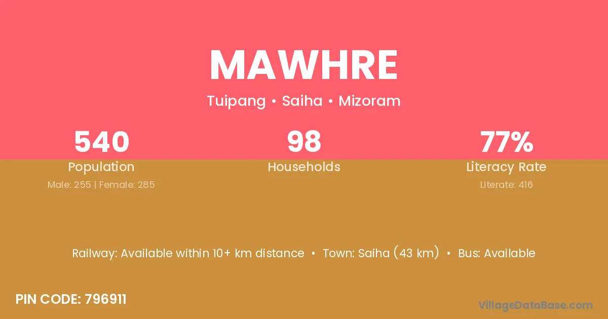 Saiha (43 km) is the nearest town to Mawhre village for major economic activities and is located approximately 43 km away.