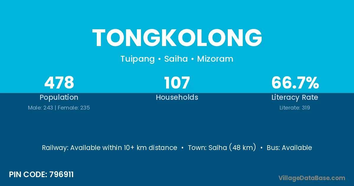 Saiha (48 km) is the nearest town to Tongkolong village for major economic activities and is located approximately 48 km away.