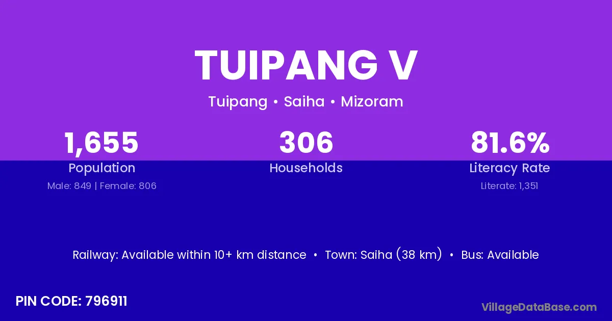 Saiha (38 km) is the nearest town to Tuipang V village for major economic activities and is located approximately 38 km away.