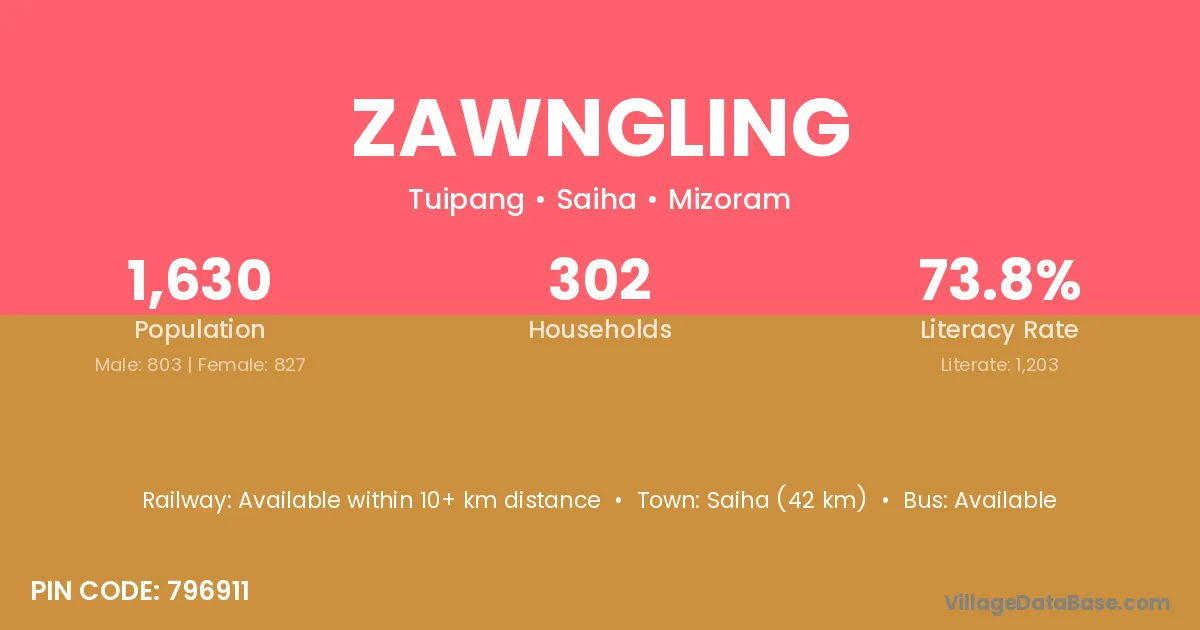 Saiha (42 km) is the nearest town to Zawngling village for major economic activities and is located approximately 42 km away.
