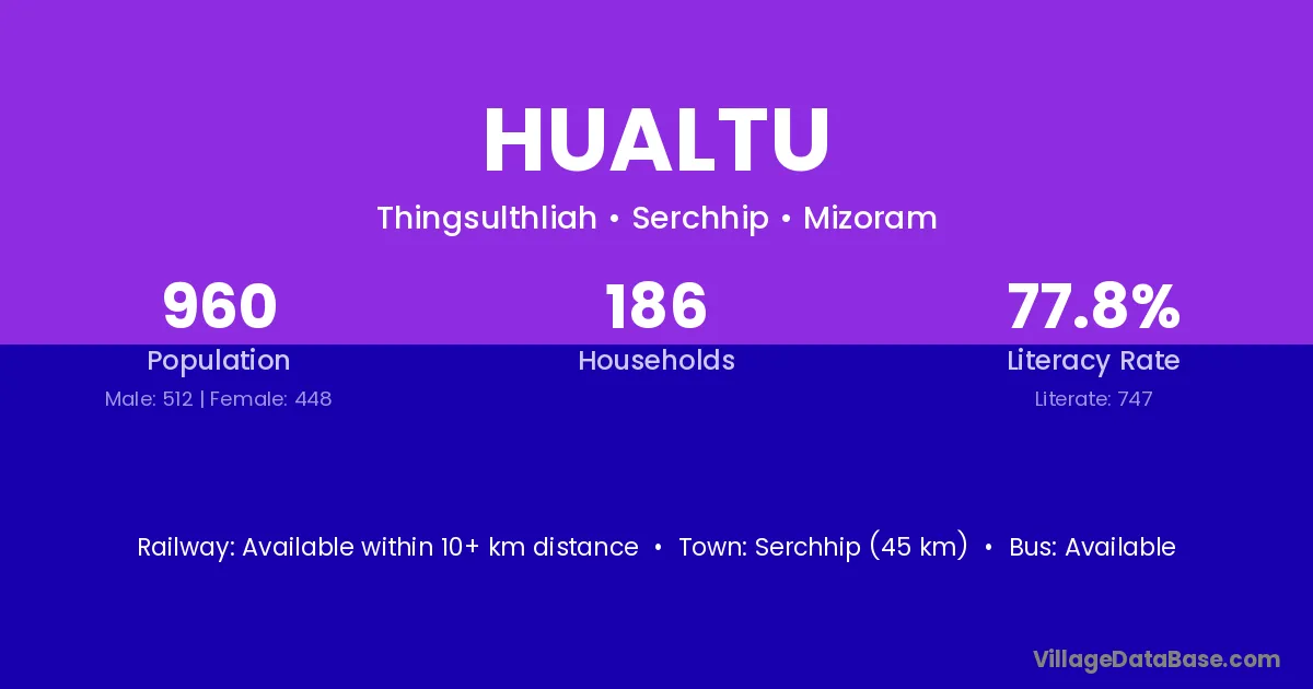 Serchhip (45 km) is the nearest town to Hualtu village for major economic activities and is located approximately 45 km away.