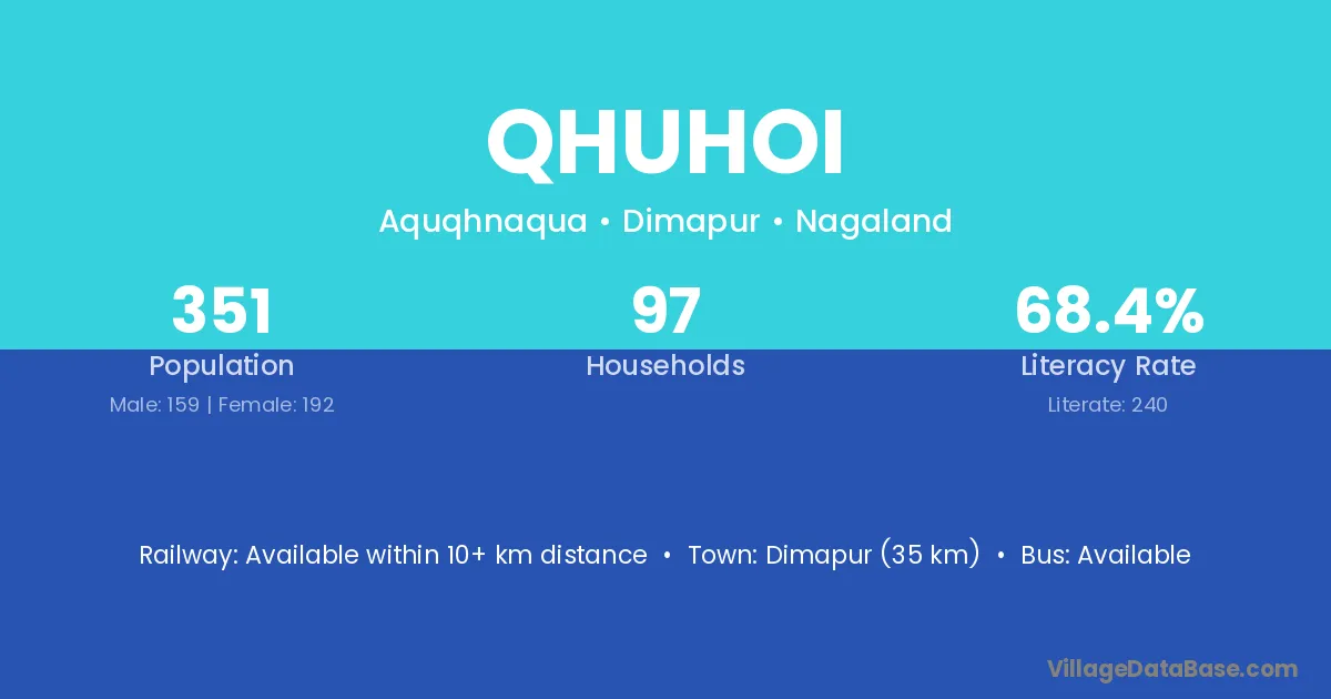 Dimapur (35 km) is the nearest town to Qhuhoi village for major economic activities and is located approximately 35 km away.