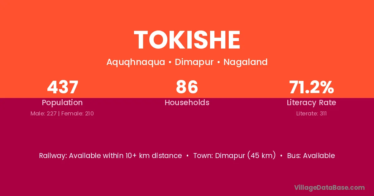 Tokishe village has a total population of 437 people, of which 227 are males and 210 are females.