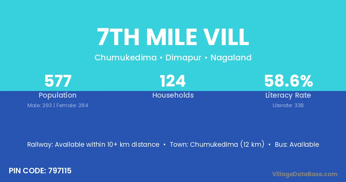 Chumukedima (12 km) is the nearest town to 7th Mile Vill village for major economic activities and is located approximately 12 km away.