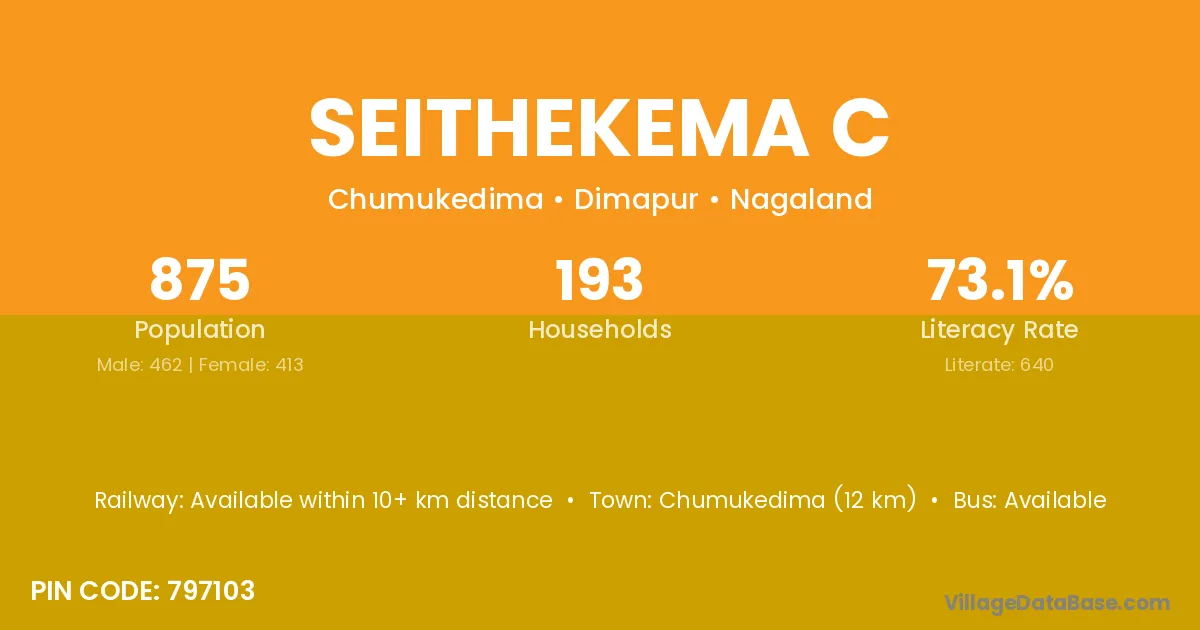 Chumukedima (12 km) is the nearest town to Seithekema C village for major economic activities and is located approximately 12 km away.