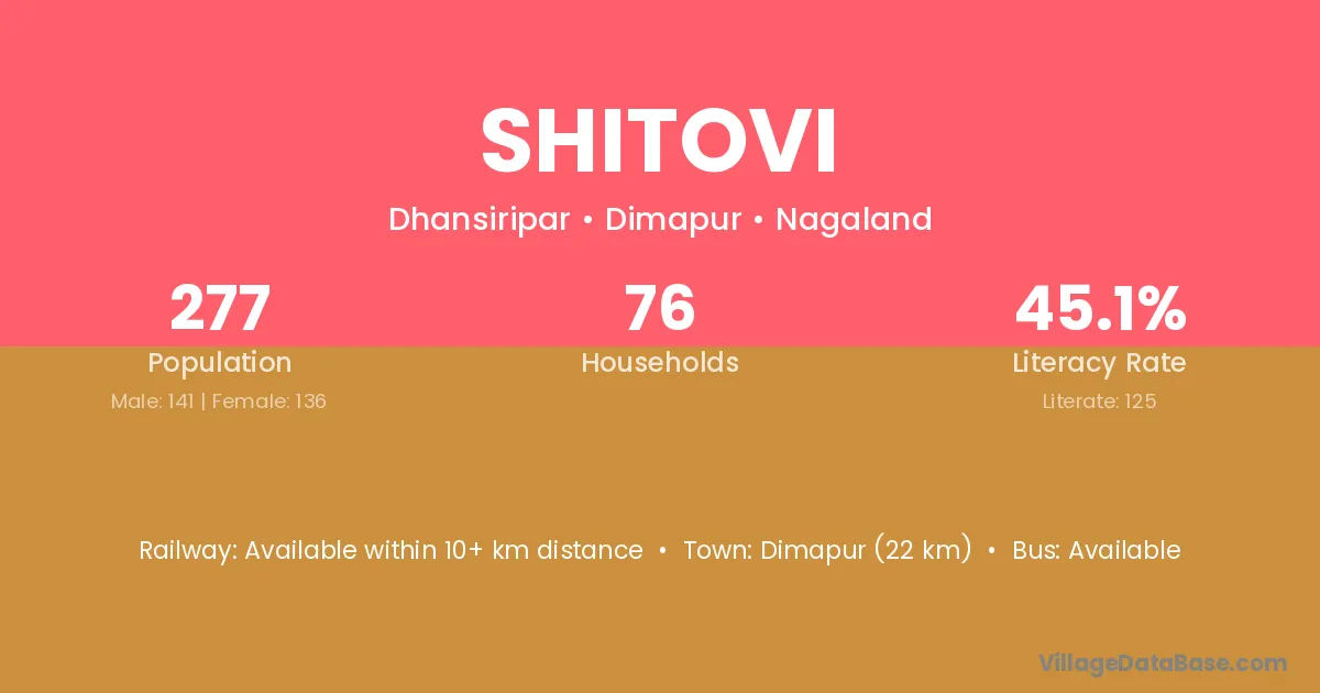 Dimapur (22 km) is the nearest town to Shitovi village for major economic activities and is located approximately 22 km away.
