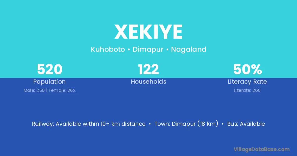 The literacy rate of Xekiye village is 50.00%. Male literacy stands at 55.04% and female literacy at 45.04%.