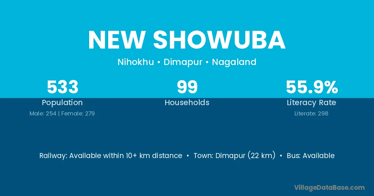 Dimapur (22 km) is the nearest town to New Showuba village for major economic activities and is located approximately 22 km away.