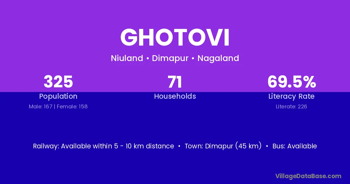 Dimapur (45 km) is the nearest town to Ghotovi village for major economic activities and is located approximately 45 km away.