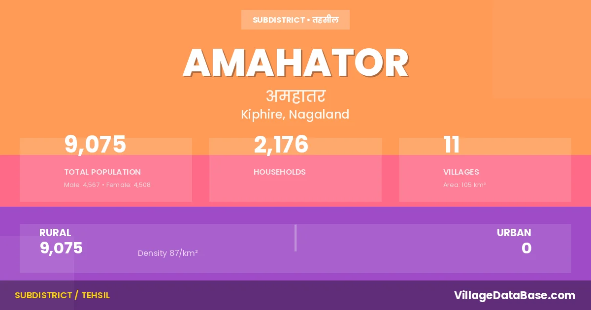 Amahator is a town and Circle in the Kiphire district of the Nagaland. In India, a Circle is a subdivision of a district responsible for the administration and revenue collection of a specific area within the district. Circles play a crucial role in the local governance structure, contributing significantly to the development and administration of their communities.
