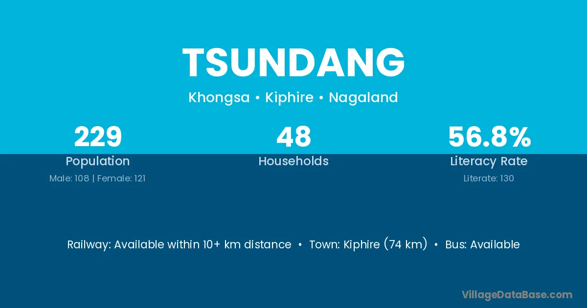 Tsundang village has a total population of 229 people, of which 108 are males and 121 are females.