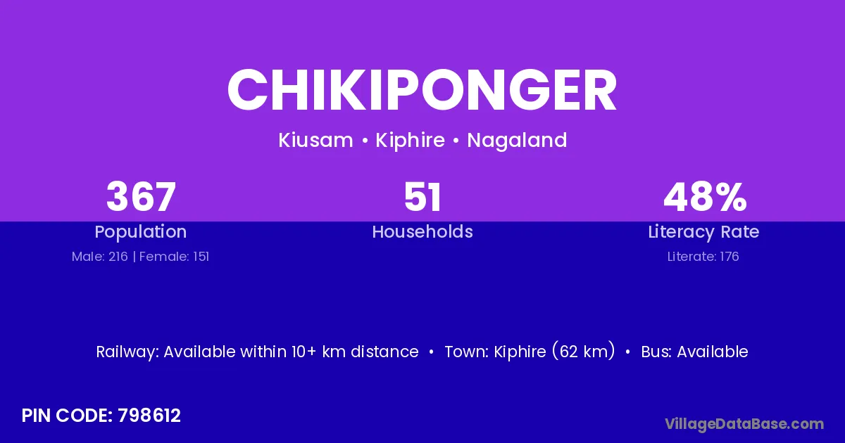 Kiphire (62 km) is the nearest town to Chikiponger village for major economic activities and is located approximately 62 km away.