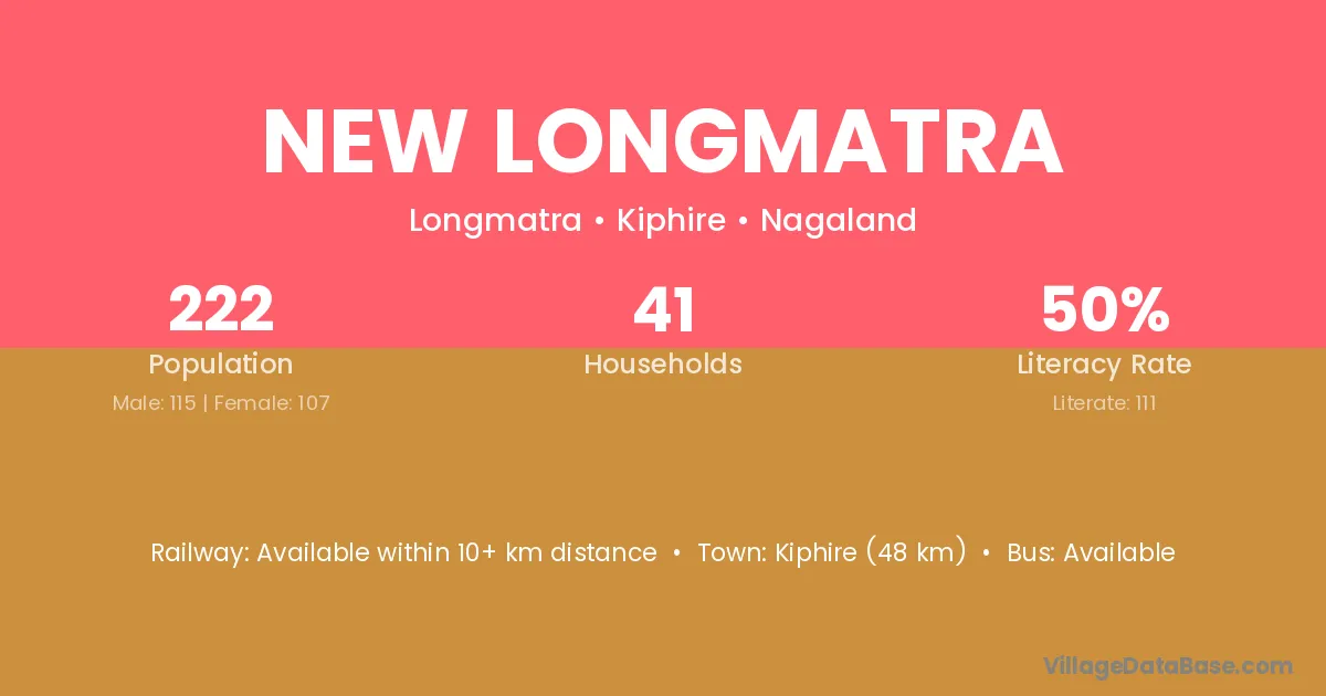 Kiphire (48 km) is the nearest town to New Longmatra village for major economic activities and is located approximately 48 km away.