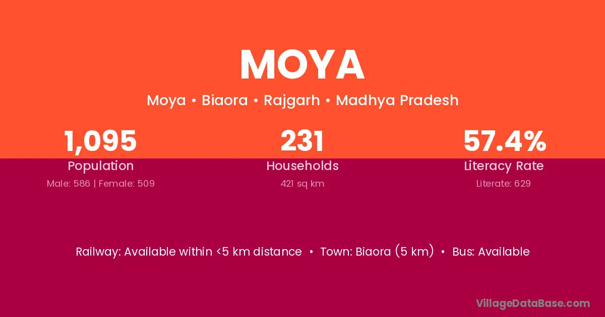The literacy rate of Moya village is 52.65%. Male literacy stands at 52.89% and female literacy at 52.38%.