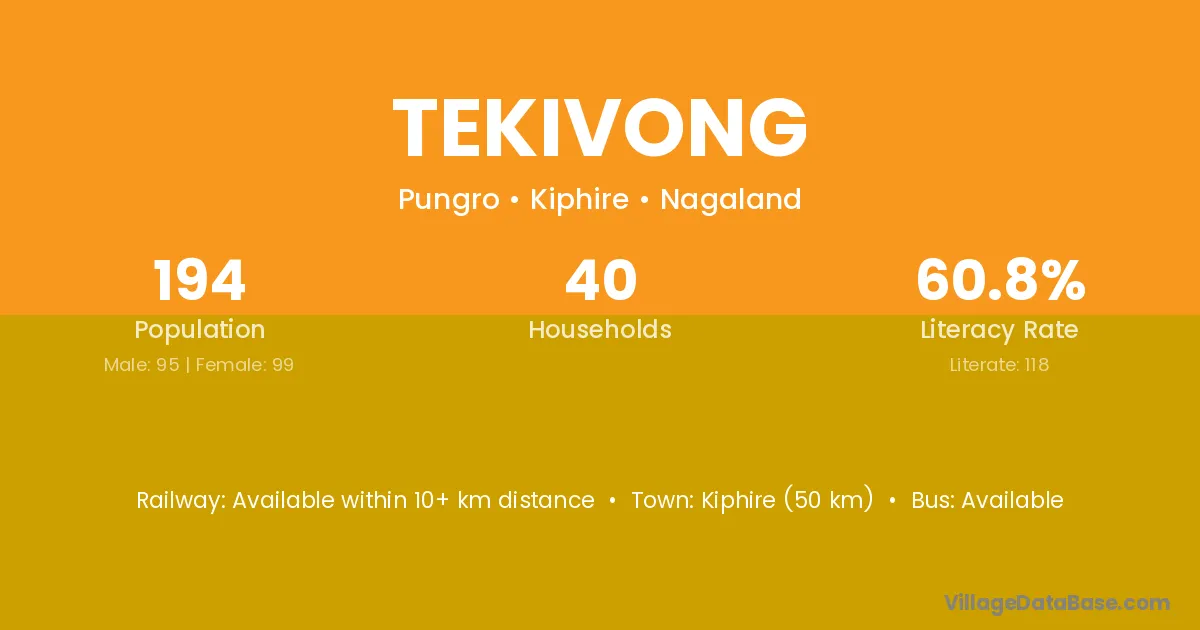 Kiphire (50 km) is the nearest town to Tekivong village for major economic activities and is located approximately 50 km away.