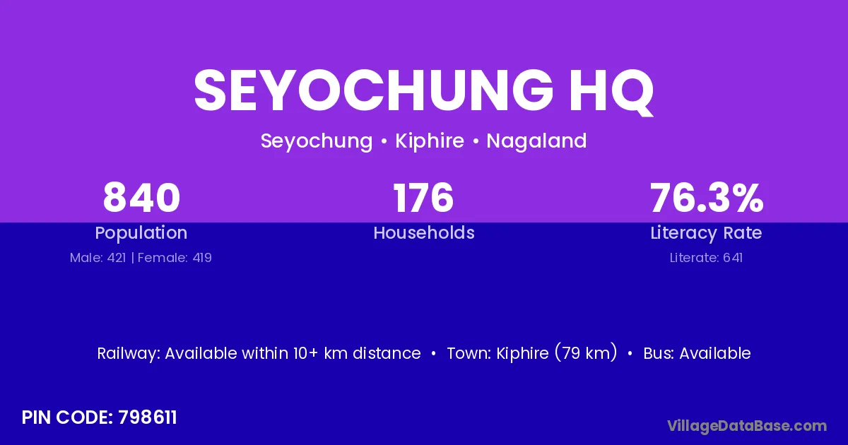 Kiphire (79 km) is the nearest town to Seyochung Hq village for major economic activities and is located approximately 79 km away.