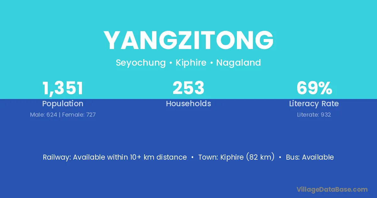 Kiphire (82 km) is the nearest town to Yangzitong village for major economic activities and is located approximately 82 km away.