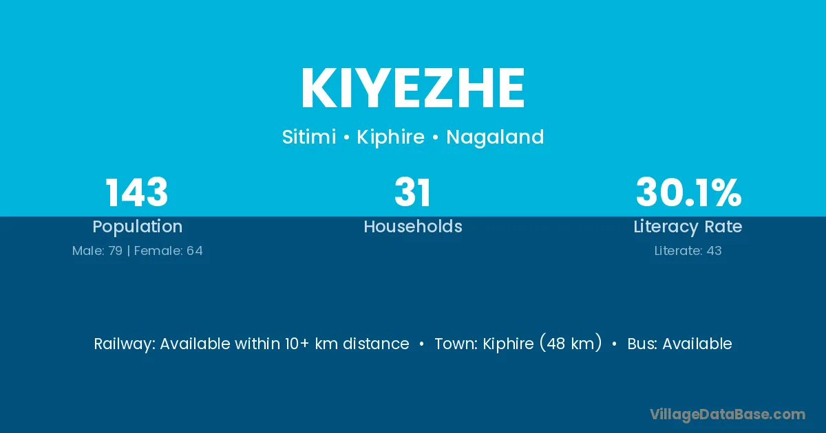 Kiyezhe village has a total population of 143 people, of which 79 are males and 64 are females.