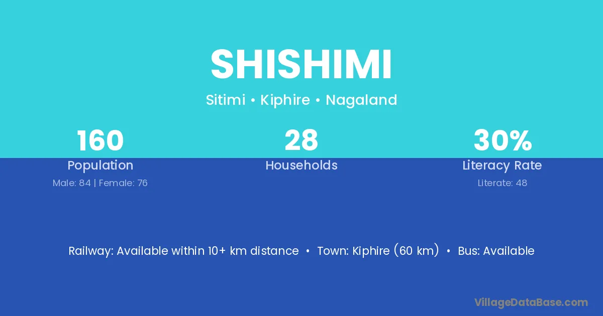Kiphire (60 km) is the nearest town to Shishimi village for major economic activities and is located approximately 60 km away.