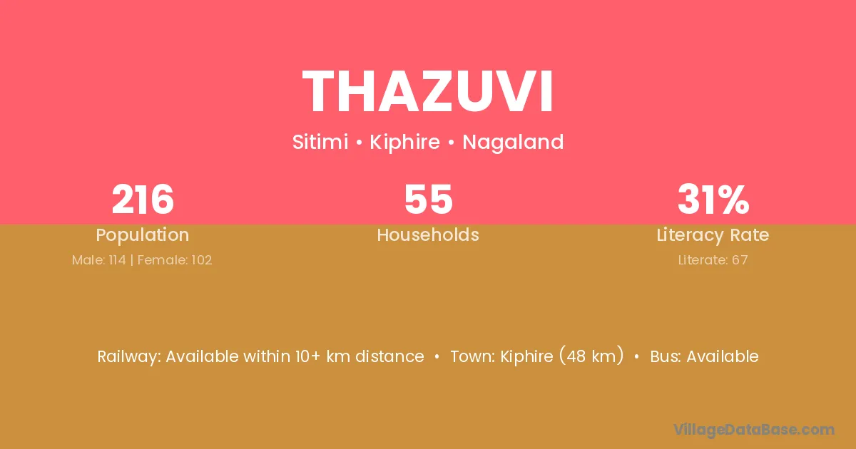 Kiphire (48 km) is the nearest town to Thazuvi village for major economic activities and is located approximately 48 km away.
