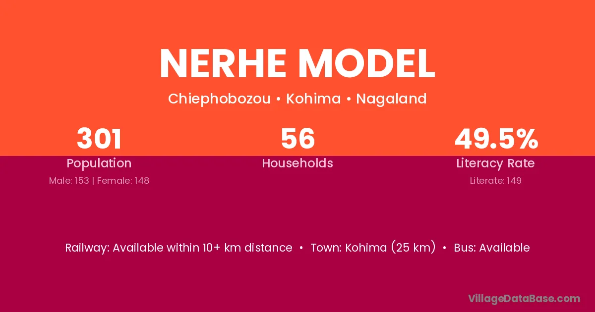 Kohima (25 km) is the nearest town to Nerhe Model village for major economic activities and is located approximately 25 km away.