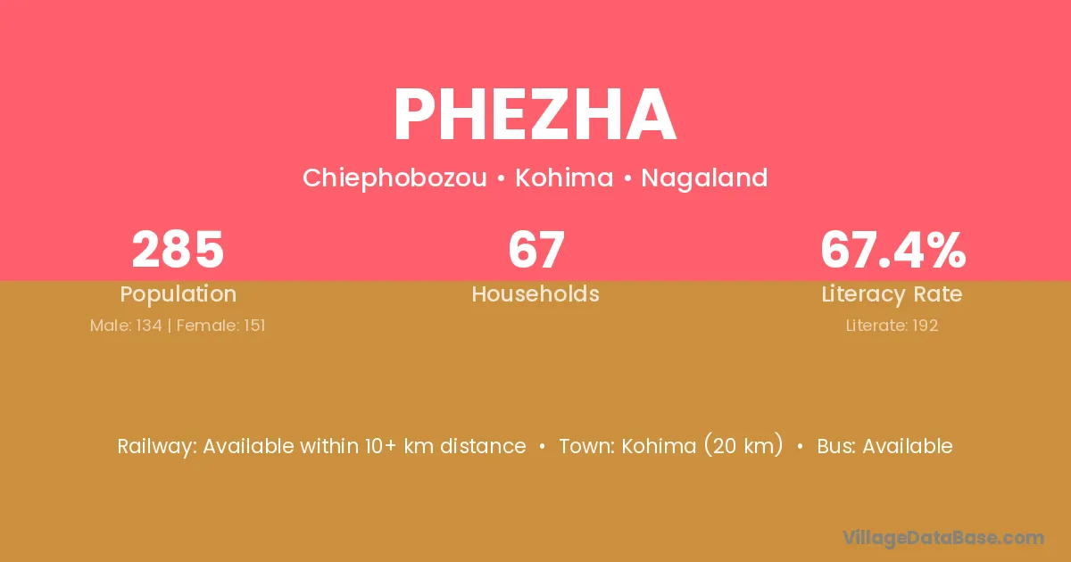 Kohima (20 km) is the nearest town to Phezha village for major economic activities and is located approximately 20 km away.