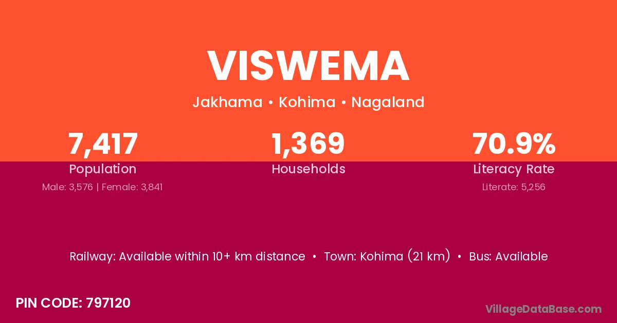 Kohima (21 km) is the nearest town to Viswema village for major economic activities and is located approximately 21 km away.