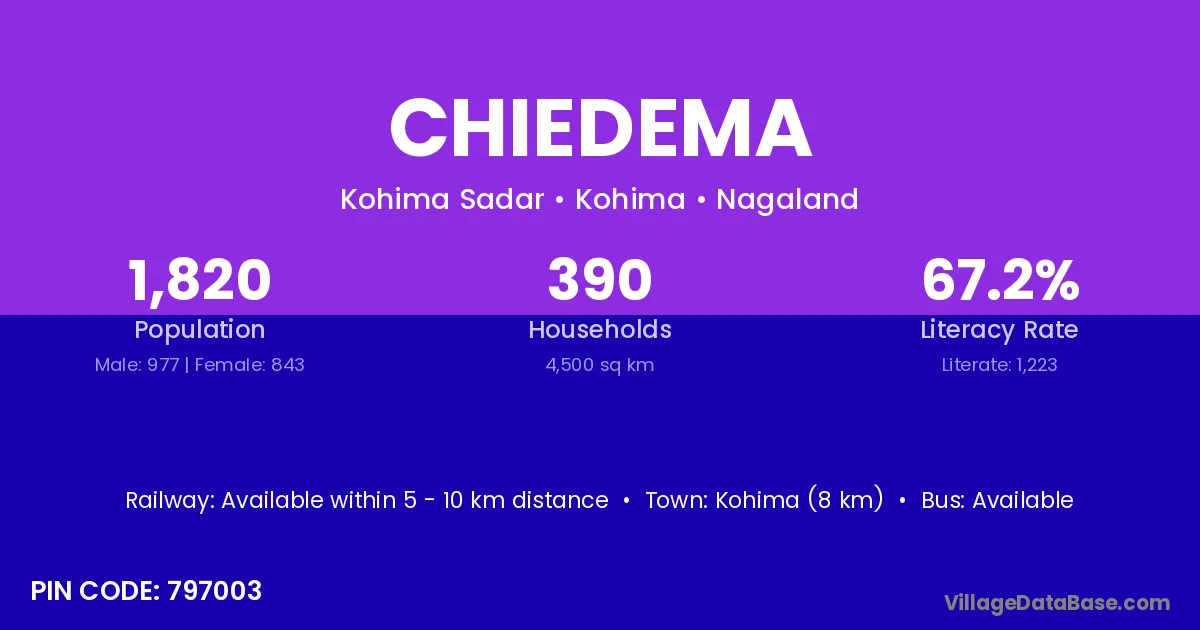 Kohima (8 km) is the nearest town to Chiedema village for major economic activities and is located approximately 8 km away.
