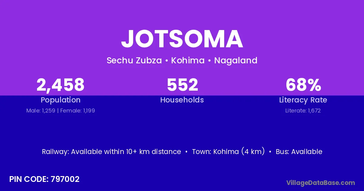 Kohima (4 km) is the nearest town to Jotsoma village for major economic activities and is located approximately 4 km away.