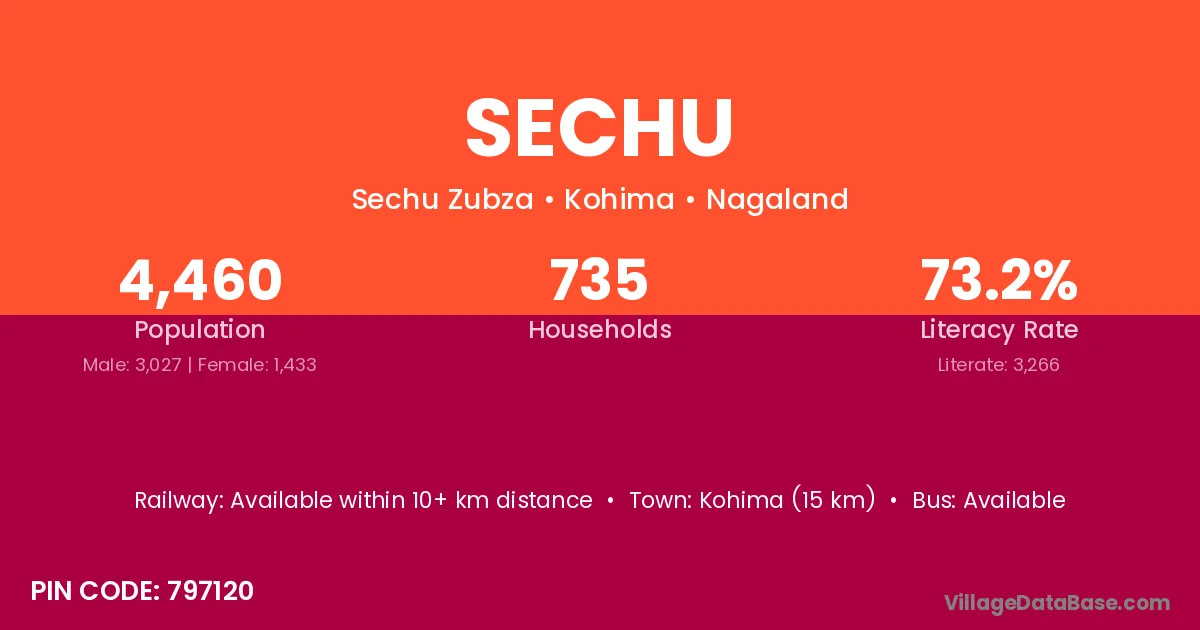 Kohima (15 km) is the nearest town to Sechu village for major economic activities and is located approximately 15 km away.