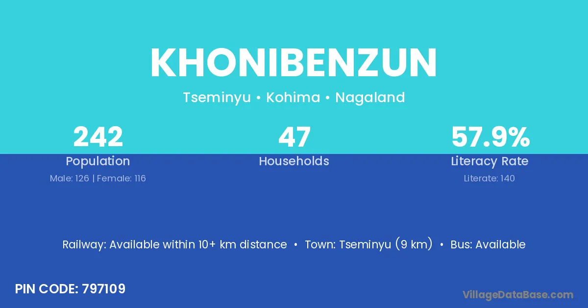 Tseminyu (9 km) is the nearest town to Khonibenzun village for major economic activities and is located approximately 9 km away.