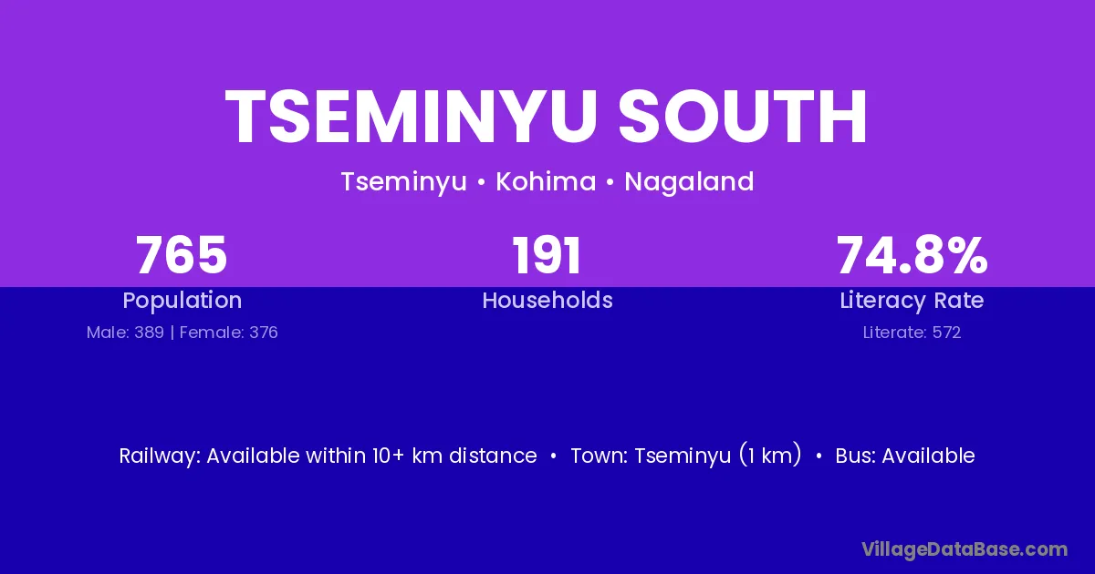 Tseminyu South village has a total population of 765 people, of which 389 are males and 376 are females.