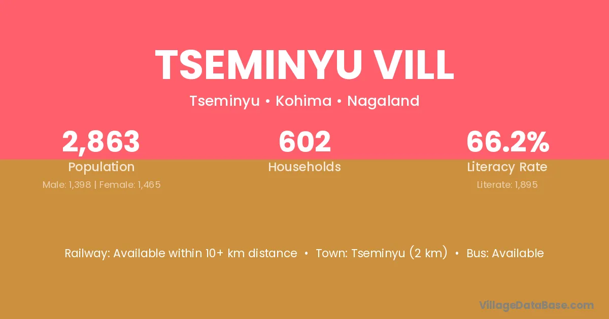 Tseminyu Vill village has a total population of 2,863 people, of which 1,398 are males and 1,465 are females.