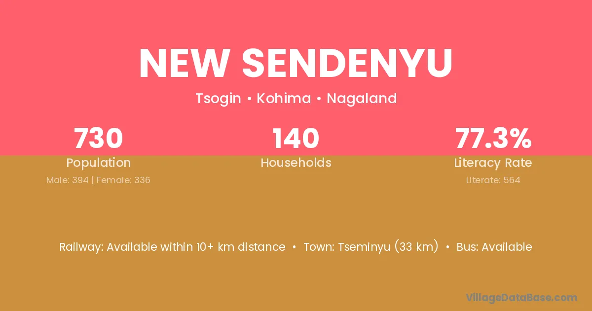 Tseminyu (33 km) is the nearest town to New Sendenyu village for major economic activities and is located approximately 33 km away.