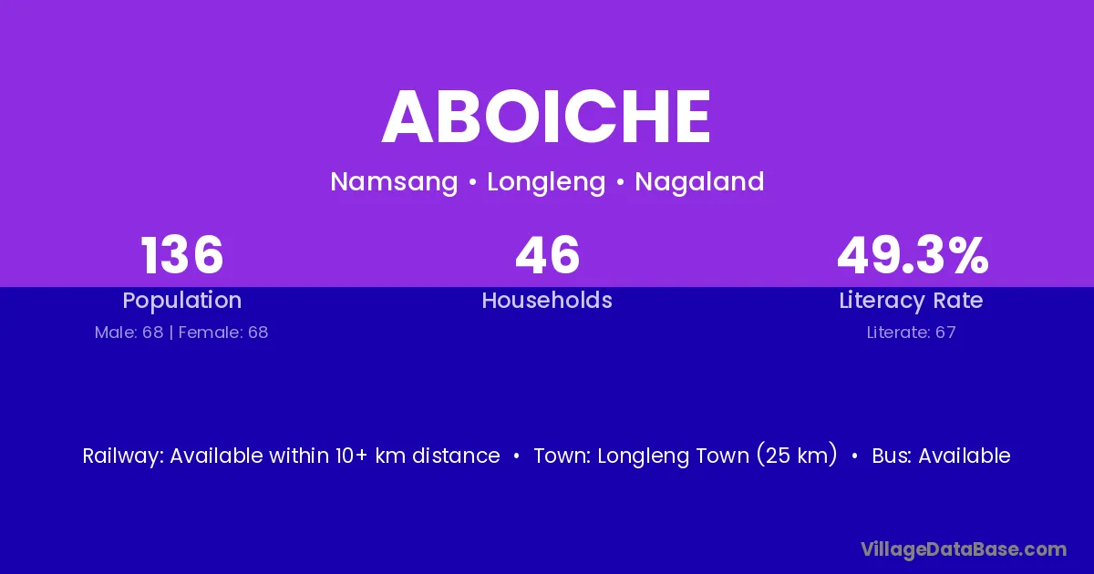 Longleng Town (25 km) is the nearest town to Aboiche village for major economic activities and is located approximately 25 km away.