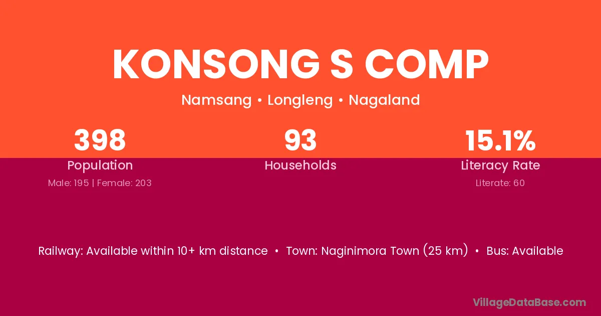 The literacy rate of Konsong S Comp village is 15.08%. Male literacy stands at 15.90% and female literacy at 14.29%.
