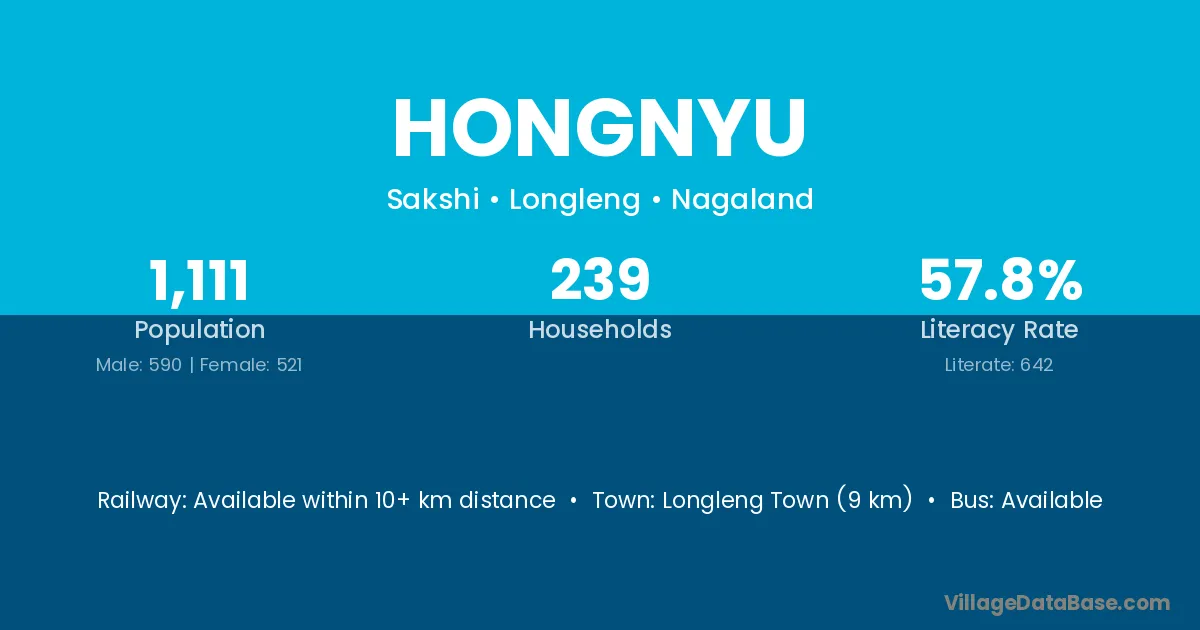 Longleng Town (9 km) is the nearest town to Hongnyu village for major economic activities and is located approximately 9 km away.