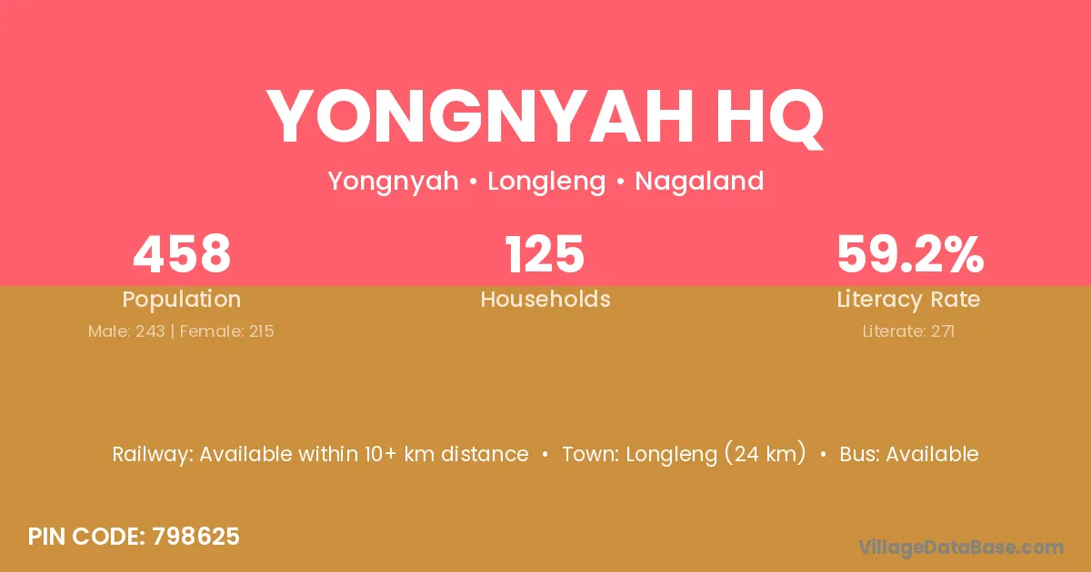 Longleng (24 km) is the nearest town to Yongnyah Hq village for major economic activities and is located approximately 24 km away.