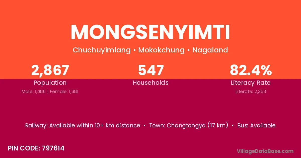 Changtongya (17 km) is the nearest town to Mongsenyimti village for major economic activities and is located approximately 17 km away.