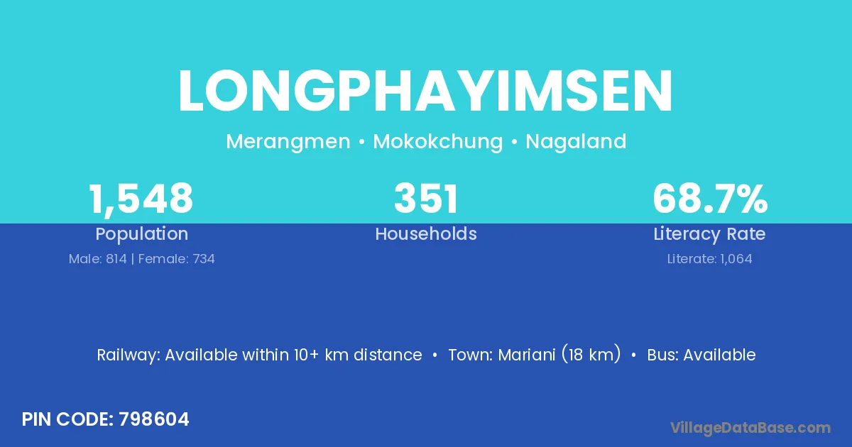 Mariani (18 km) is the nearest town to Longphayimsen village for major economic activities and is located approximately 18 km away.