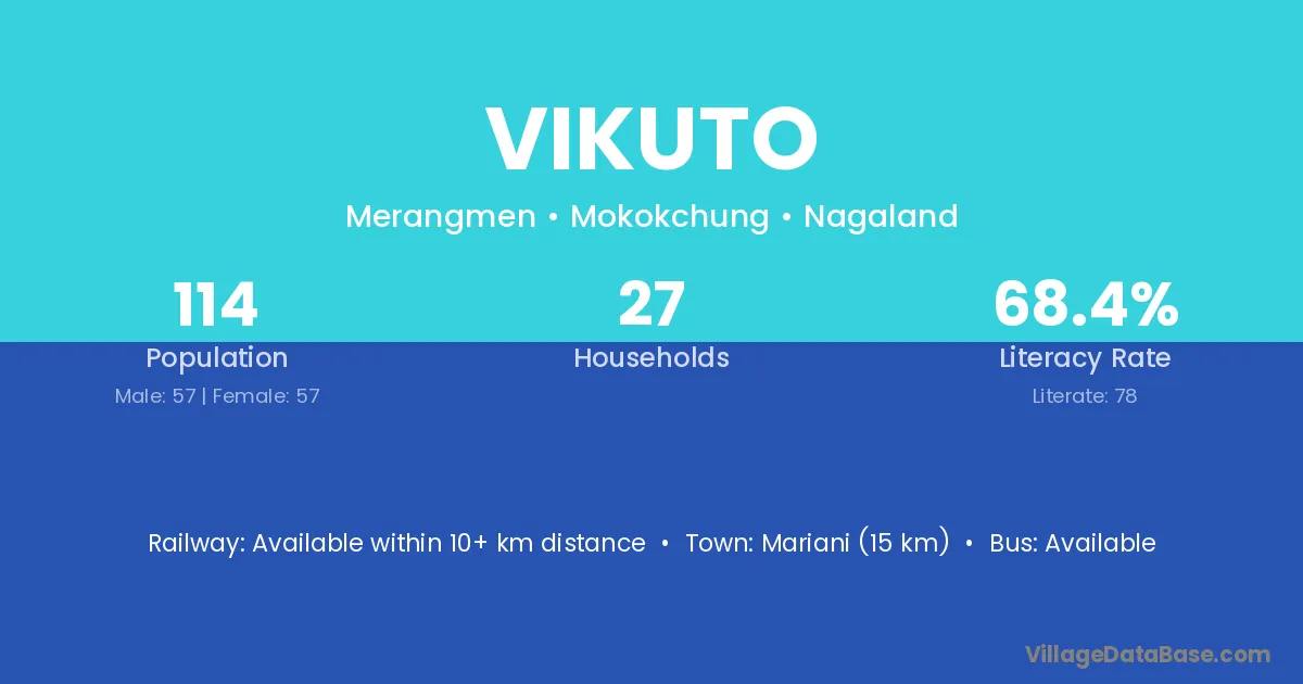 Vikuto village has a total population of 114 people, of which 57 are males and 57 are females.