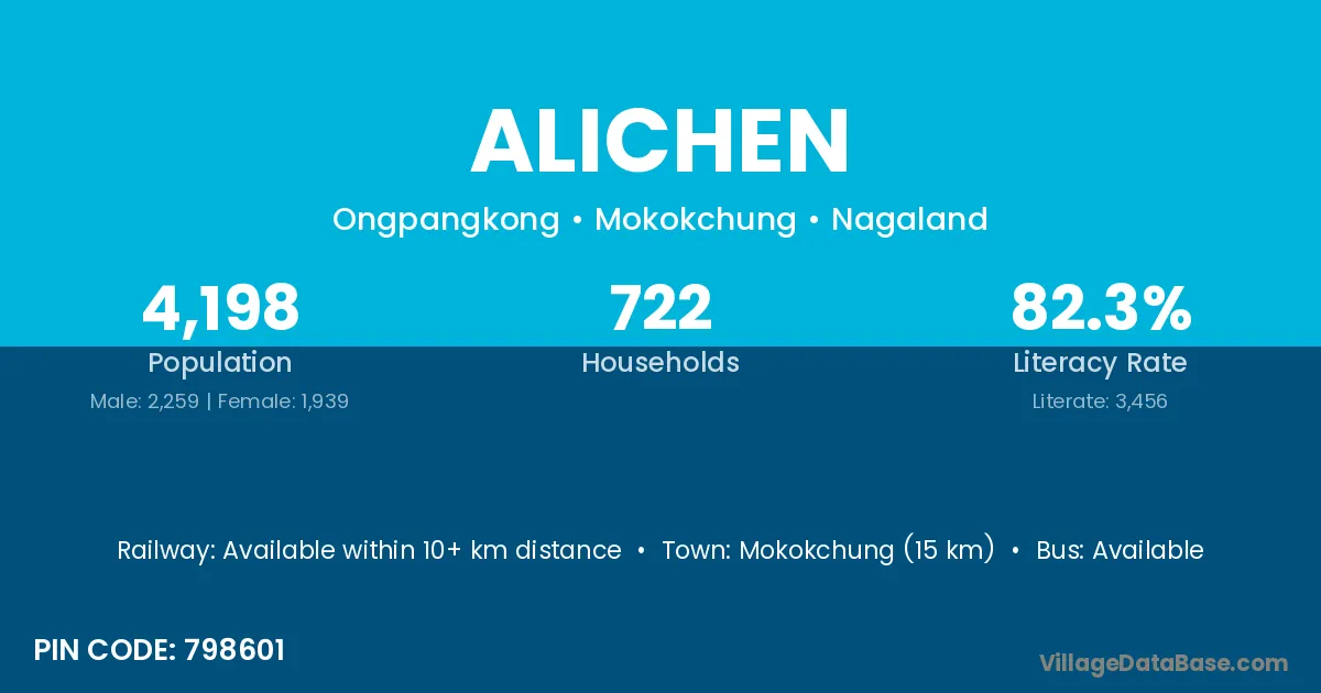 Mokokchung (15 km) is the nearest town to Alichen village for major economic activities and is located approximately 15 km away.