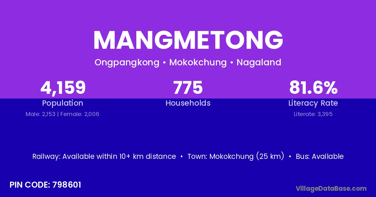 Mokokchung (25 km) is the nearest town to Mangmetong village for major economic activities and is located approximately 25 km away.