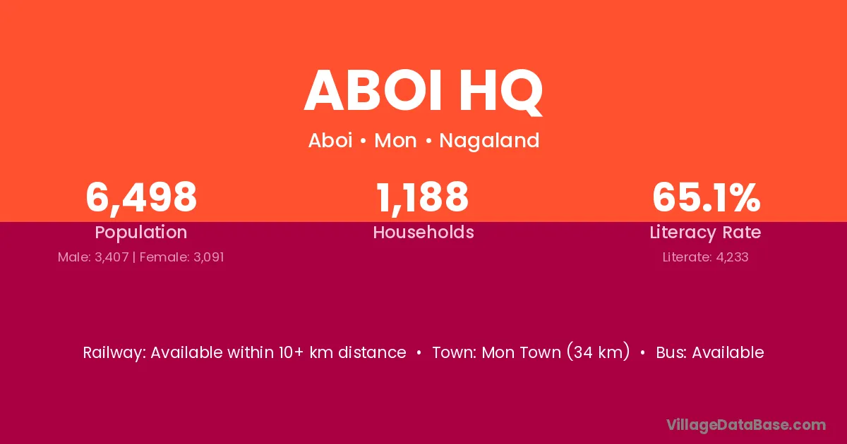 Mon Town (34 km) is the nearest town to Aboi Hq village for major economic activities and is located approximately 34 km away.