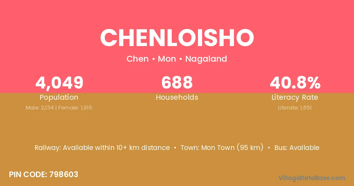 Mon Town (95 km) is the nearest town to Chenloisho village for major economic activities and is located approximately 95 km away.
